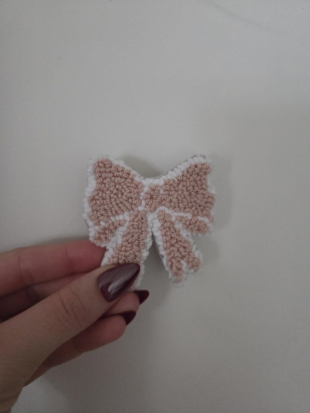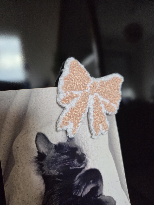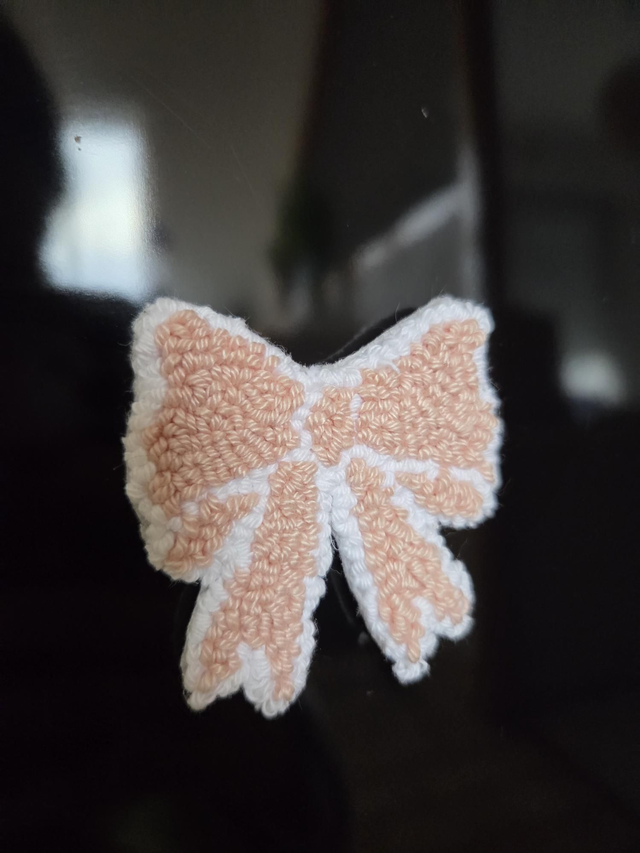 Ajoutez une touche de douceur à votre quotidien avec le magnet Nœud rose, une création artisanale réalisée à la main en punch needle.